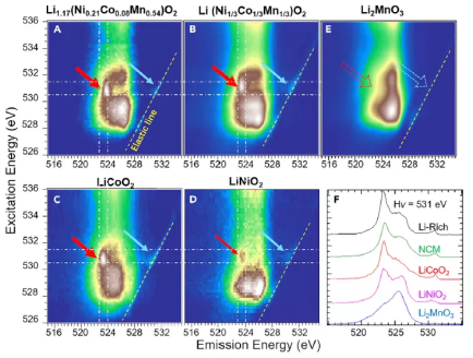图1. 不同正极材料在完全充电状态下的O-K mRIXS图谱比较