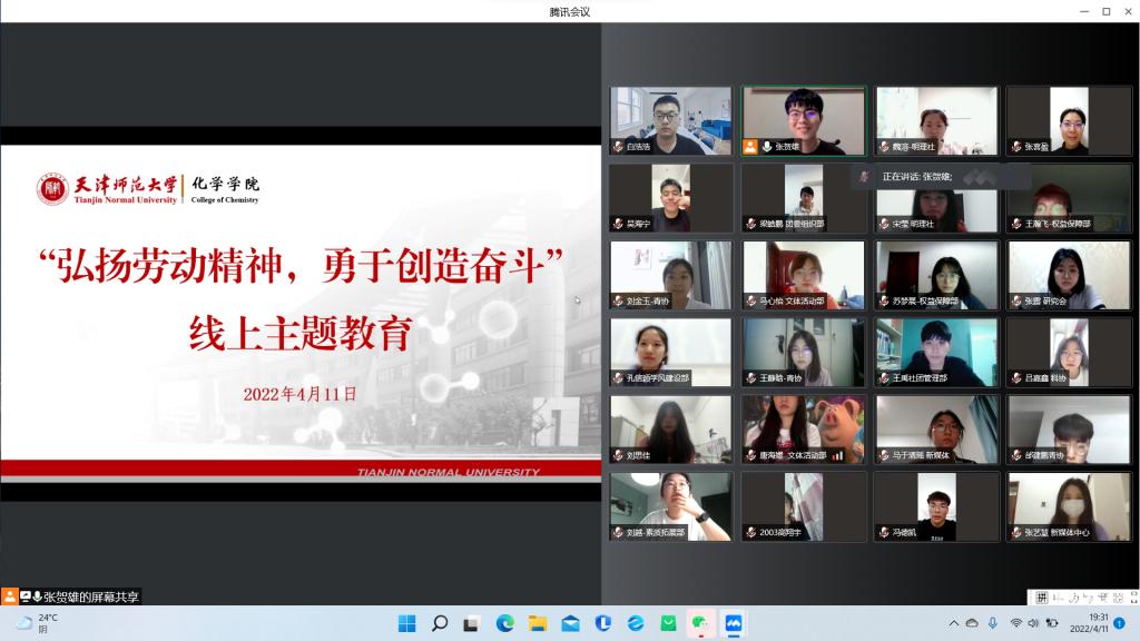 为进一步引导学生弘扬劳动精神,提升劳动技能,近日,化学学院组织开展“弘扬劳动精神 勇于创造奋斗”线上劳动教育主题活动。学院辅导员张喜盈、40余名学生代表共同参会。