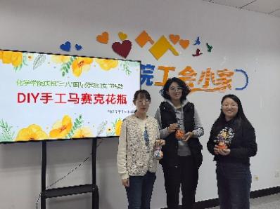 为庆祝第115个“三八”国际劳动妇女节,化学学院工会以“巧手创艺·点亮生活”为主题,于2025年3月6日在工会小家组织开展了DIY马赛克花瓶手工制作活动。活动旨在通过创意手工实践,丰富女教职工的业余文化生活,提升艺术审美能力,同时增强团队凝聚力,传递工会对女性教职工的关怀与节日祝福。